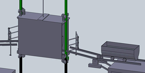 液压补偿罐道的中间运行状态,此时摇台已经打开实现与提升容器中轨道的对接,人字形安全门也已完全打开,连接补偿罐道和组合罐道的支撑梁也已打开,补偿罐道正处于打开过程中。